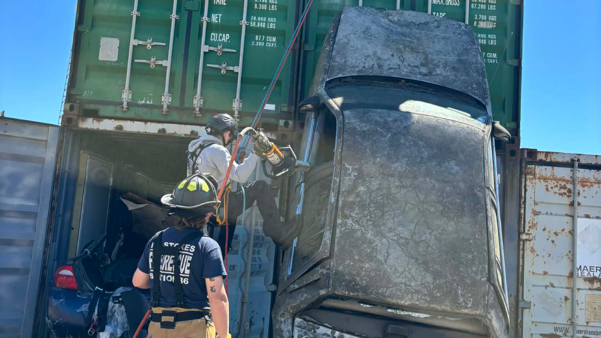 vehicle in a structure with a patient pinned in, another